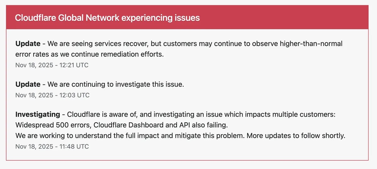 2025年11月18日上午約11點20分(UTC時間),Cloudflare網路開始出現嚴重異常,核心網路流量無法正常傳遞,導致大量依賴其CDN、安全防護、代理與流量管理服務的網站與應用無法運作,普遍回傳HTTP 5xx錯誤或出現連線逾時。直到下午約17點06分(UTC)才全面恢復,事故持續時間接近5小時。