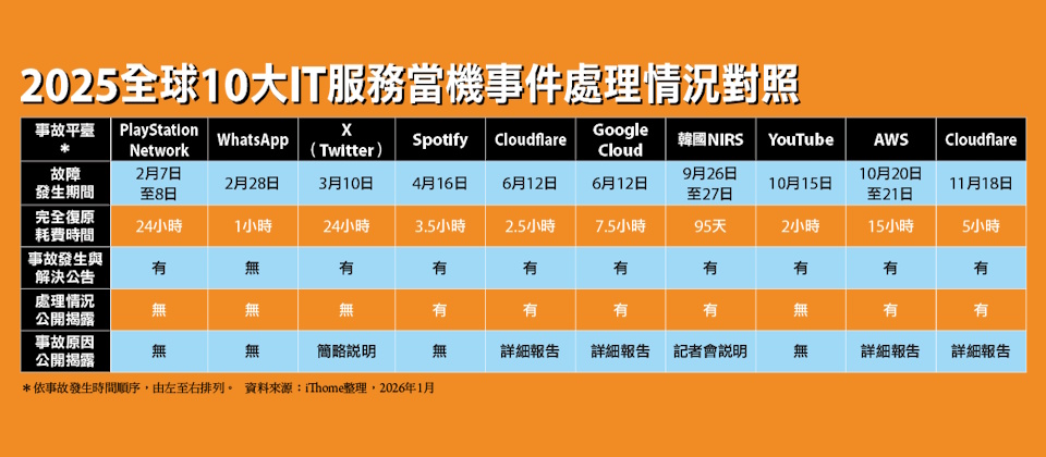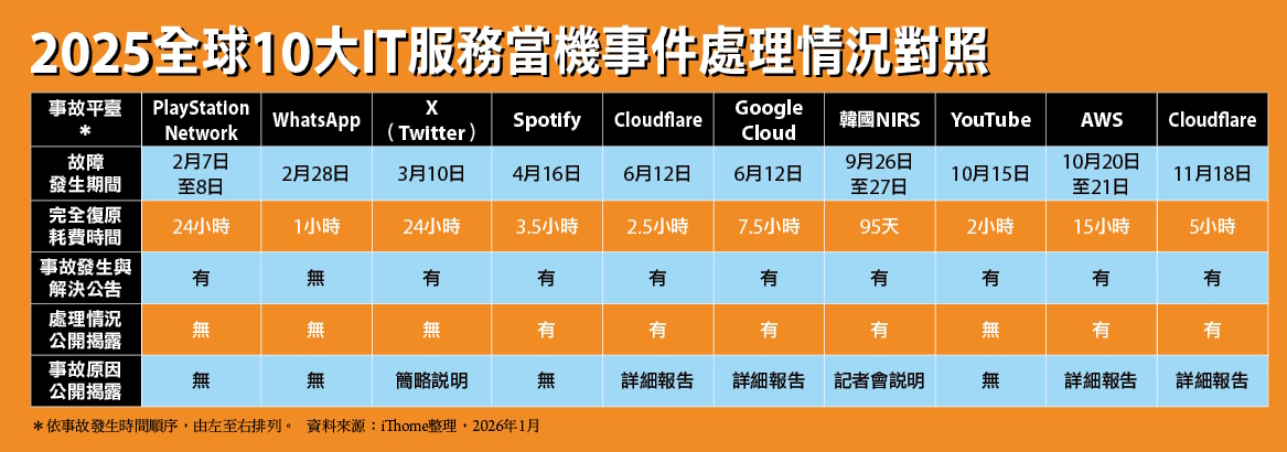其次,在事故原因揭露的層面上,整體情況同樣分歧。在10大事故中,有4起事故完全未公布事故原因,包括PlayStation Network、YouTube、Spotify與WhatsApp;另有1起事故僅公布相當粗略的說明,即X(Twitter);而其餘5起事故,則公布了較為完整的事故原因與調查報告,分別為AWS、韓國NIRS、Google Cloud,以及Cloudflare的2起事故。