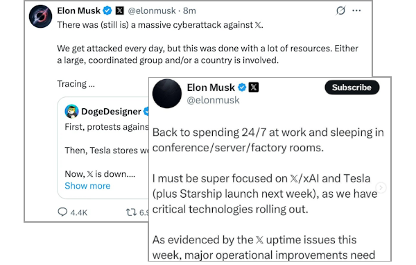 在2025年3月10日與5月24日的2次大規模服務中斷事件中,X(Twitter)都只由負責人馬斯克在個人帳號上發布簡短說明,平臺本身沒有對事故狀態與原因,即時更新現況說明與細節解釋。圖片來源/X