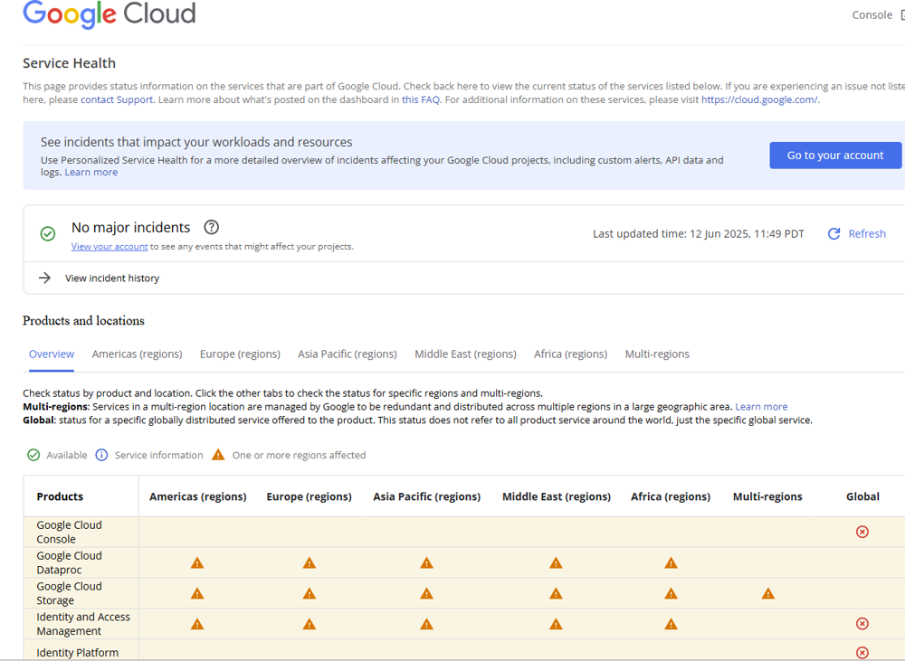 2025年6月12日,Google Cloud發生全球範圍的大規模服務中斷事故,導致旗下多項核心雲端產品,以及依賴其基礎架構的第三方平臺服務出現中斷或錯誤回應。事故自當天上午10點51分起,至下午18點18分結束(均為太平洋時間),持續約7.5小時。