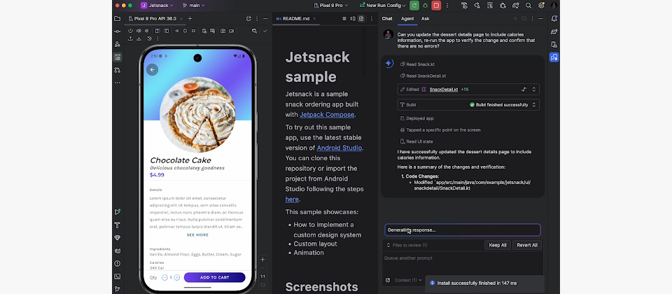 Android Studio Otter 3將代理的工作範圍延伸到驗證修改結果。代理可將應用部署到連接裝置,讀取畫面並截圖,檢視Logcat錯誤訊息,並與正在執行的應用互動,協助反覆修正並確認改動是否生效。Android Studio新增集中管理代理修改的變更清單,會把代理動過的檔案彙整列出,讓開發者直接在IDE內檢視差異,並可逐一保留或撤回修改,同時也支援多個對話串,讓不同任務分開進行,避免互相干擾。