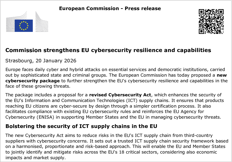 歐盟執委會(European Commission)於1月20日公布新一波「網路安全包裹法案(Cybersecurity Package)」,內容包括修訂《歐盟網路安全法》(EU Cybersecurity Act)、擴大歐盟網路安全局(European Union Agency for Cybersecurity,ENISA)職權,以及推動供應鏈去風險化措施。歐盟藉此希望把過去僅具政策指引性質、各成員國執行程度不一的供應鏈風險管理,納入具法律拘束力的共同規範。