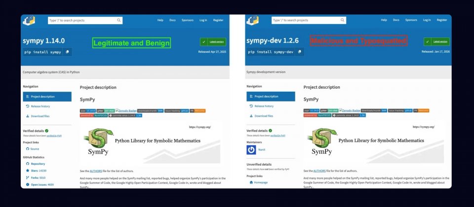 該攻擊結合近年開源生態常見的誤植名稱(Typosquat)與專案頁面仿冒攻擊手法,由於開發者平時透過pip安裝相依套件時,往往仰賴套件名稱與頁面描述作為快速判斷依據,而攻擊者藉由相似名稱與複製內容提高誤導開發者安裝機率。研究人員提到,SymPy套件使用情境涵蓋研究、教育與工程等領域,屬於高曝光套件,仿冒者不需要很大的散布量,只要有少量開發者被誘騙安裝,就能在特定社群與流程中擴散。