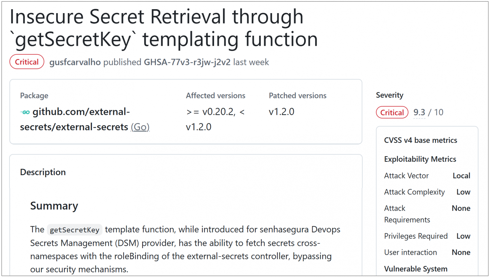 External Secrets Operator開發團隊指出,該漏洞影響v0.20.2以上、v1.2.0以前的多個版本。由於問題源自功能設計本身,而非單純的程式實作錯誤,官方最終選擇在v1.2.0版本中,完全移除getSecretKey相關功能,改以其他受控方式存取祕密資料。