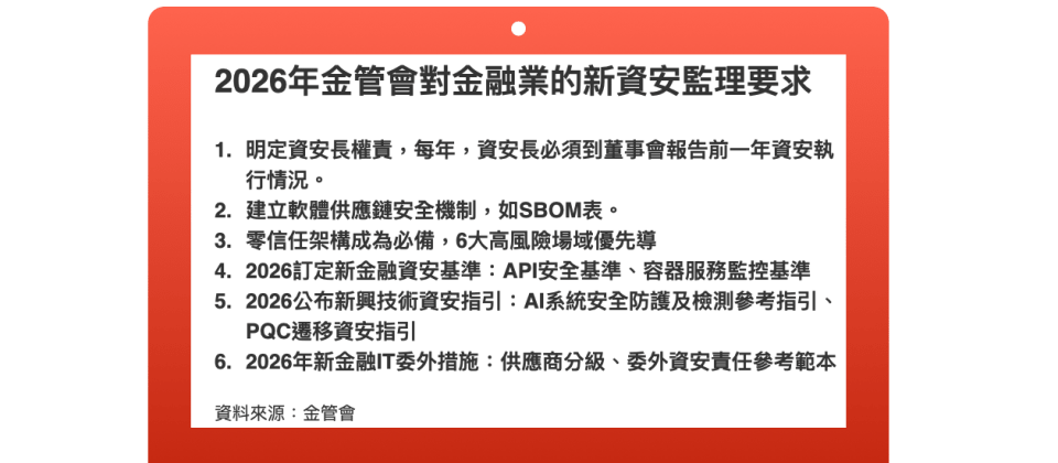 2026年,還增加了三項對金融業的新資安監理要求,包括了明定金融資安長的權責、零信任架構從鼓勵轉為必備,以及必須建立軟體供應鏈安全機制如SBOM。