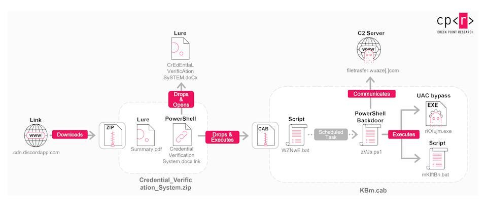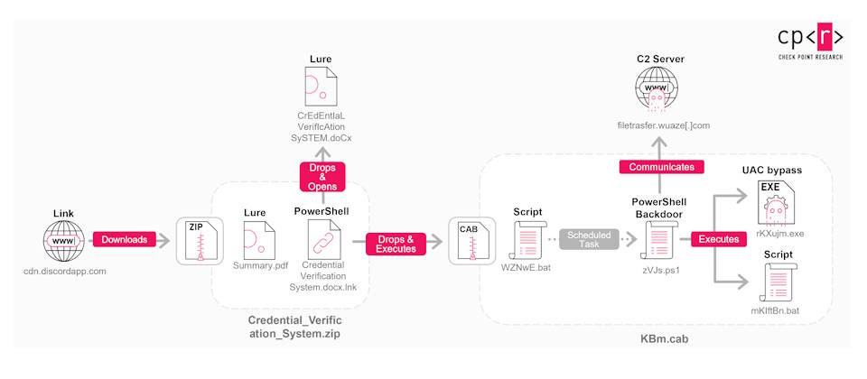 針對攻擊行動的流程,是從Discord伺服器的連結開始,使用者點選後,將下載ZIP檔,其內容包含誘餌PDF檔,以及Windows捷徑檔(LNK),一旦啟動LNK檔,電腦就會執行PowerShell惡意程式載入工具,解出Word文件與CAB檔,並開啟文件檔案誘餌,以轉移使用者注意力,然後擷取CAB檔內容,包括:PowerShell後門、批次檔案,以及用來繞過使用者存取控制(UAC)的工具,最終駭客啟動後門程式,以進行下個階段的活動。不過,對於駭客如何引誘使用者點選Discord連結啟動感染鏈,Check Point並未說明。