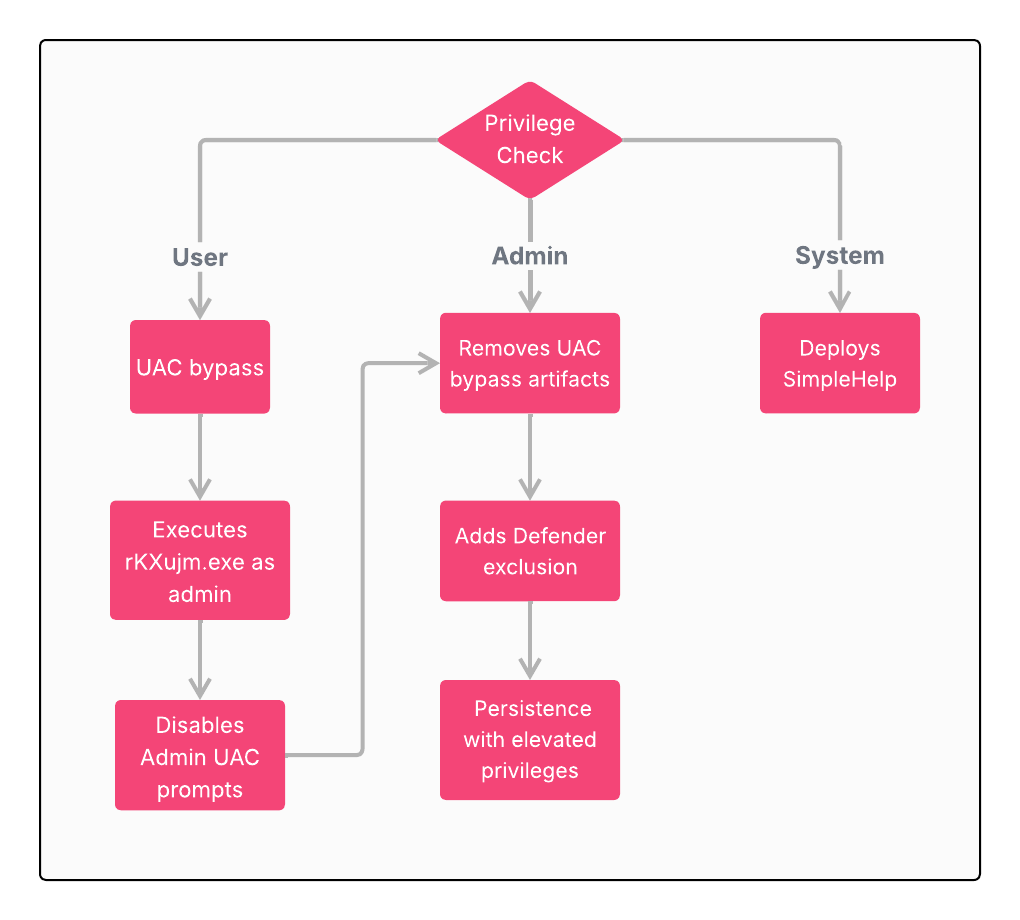 接著,後門將確認取得的權限,若是一般使用者,該後門將會執行UAC繞過工具來提升權限;假如是管理員,則會在防毒軟體Microsoft Defender將惡意程式列入白名單,並執行另一個批次檔;如果後門得到SYSTEM層級權限,就會部署遠端管理工具SimpleHelp。