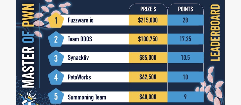 此次第一名的隊伍為來自歐洲的Fuzzware.io團隊,該團隊取得了28分的成績,抱走21.5萬美元的獎金;第二名則是跨國團隊Team DDOS,拿到17.25分的成績與約10萬美元的獎金;第三名的Synacktiv為法國資安公司,雖然只帶走8.5萬美元的獎金,卻是唯一透過USB攻陷特斯拉資訊娛樂系統的團隊。
