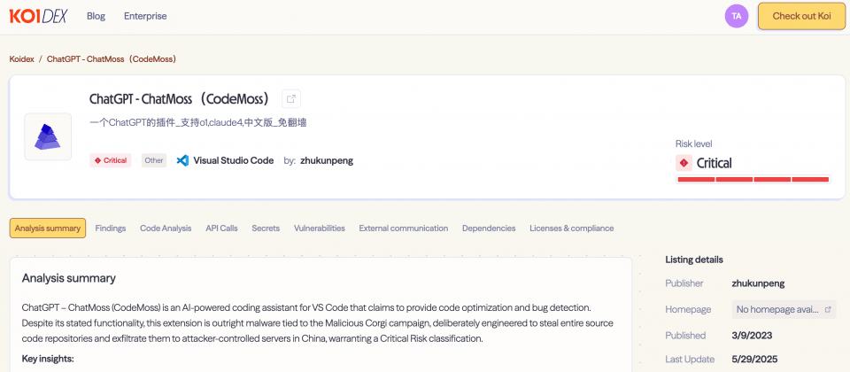 被點名的延伸套件為ChatGPT - 中文版與ChatGPT - ChatMoss(CodeMoss)。研究人員指出,兩者含有相同的惡意程式碼與後端架構,只是以不同發行者身分在市集中流通。以2026年1月27日Marketplace頁面為準,ChatGPT - 中文版累計1,340,885次安裝,ChatGPT - ChatMoss(CodeMoss)則超過15萬次。