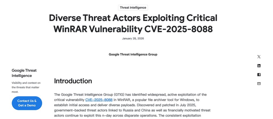 去年7月底,知名壓縮軟體WinRAR開發商Rarlab發布7.13版,修補高風險路徑遍歷漏洞CVE-2025-8088,CVSS風險評為8.8分(4.0版為8.4分),最早通報漏洞的資安業者 ESET 指出,發現漏洞的起因,是俄羅斯駭客組織RomCom已實際將其用於攻擊行動,目標涵蓋歐洲與加拿大的金融、製造、國防及物流產業。