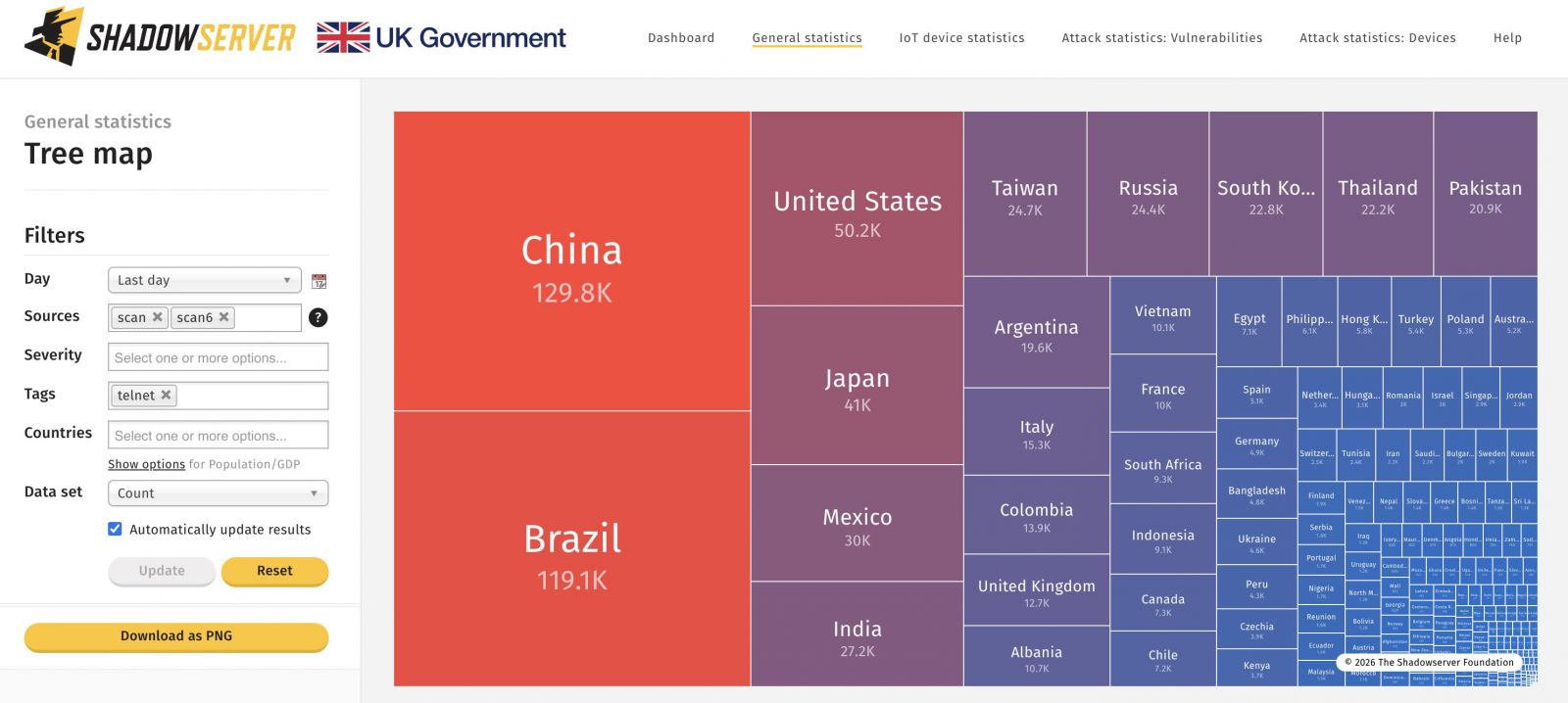 上周研究人員揭露GNU Inetutils telnetd重大漏洞CVE-2026-24061,網路安全調查顯示,網路上有將近80萬伺服器曝險。非營利網路研究及偵測機構ShadowServer Foundation本周掃描結果顯示,存在本漏洞的Telnet伺服器已由最高峰的148萬臺減少,但截至1月26日,仍有超過80萬臺曝險。以曝險伺服器數量而言,中國(13萬)、巴西(12萬)和美國(5萬)為前三大,臺灣也有2萬4千多臺Telnet伺服器曝險。