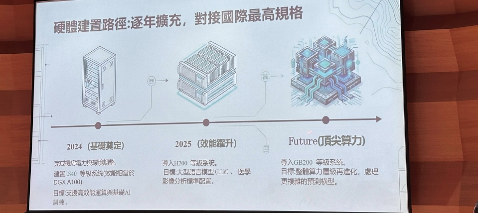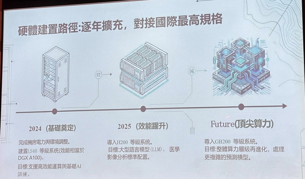 2025年進一步導入H200等級系統,為大型語言模型(LLM)與醫學影像分析做準備,未來還將引進GB200等級系統,以因應更高複雜度的模型運算需求。