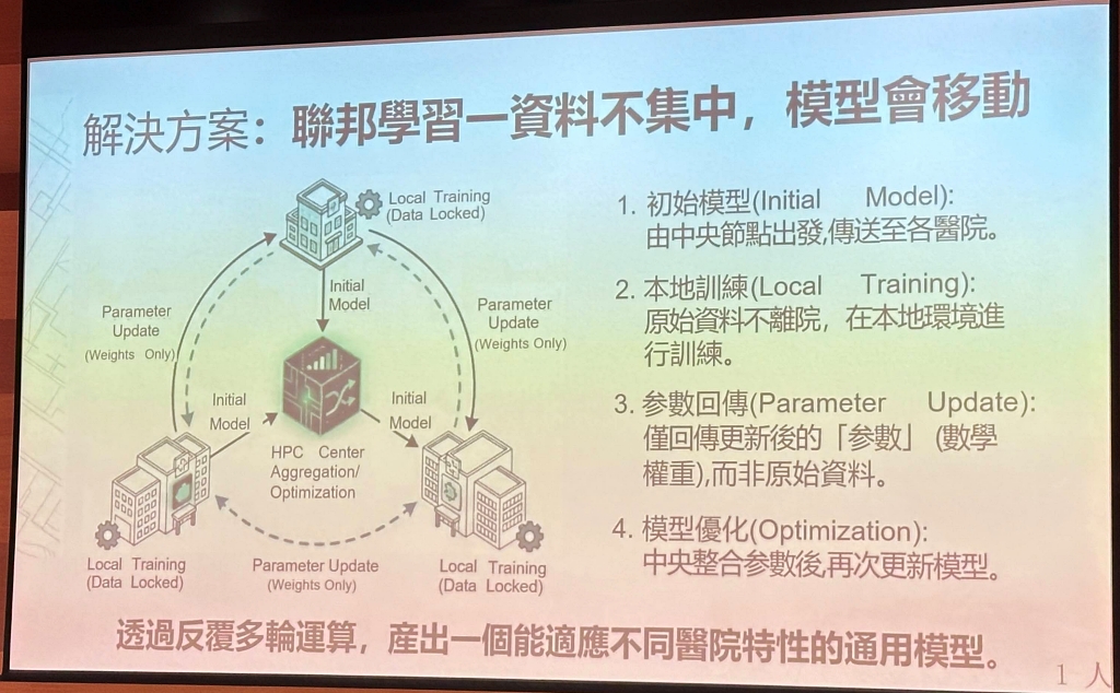 但醫療資料高度敏感,政府也不可能將全臺醫療資料集中到單一資料庫來訓練模型。為此,衛福部選擇聯邦學習作為解方,讓資料不離開醫院,也能進行接近全國規模的模型訓練與驗證。