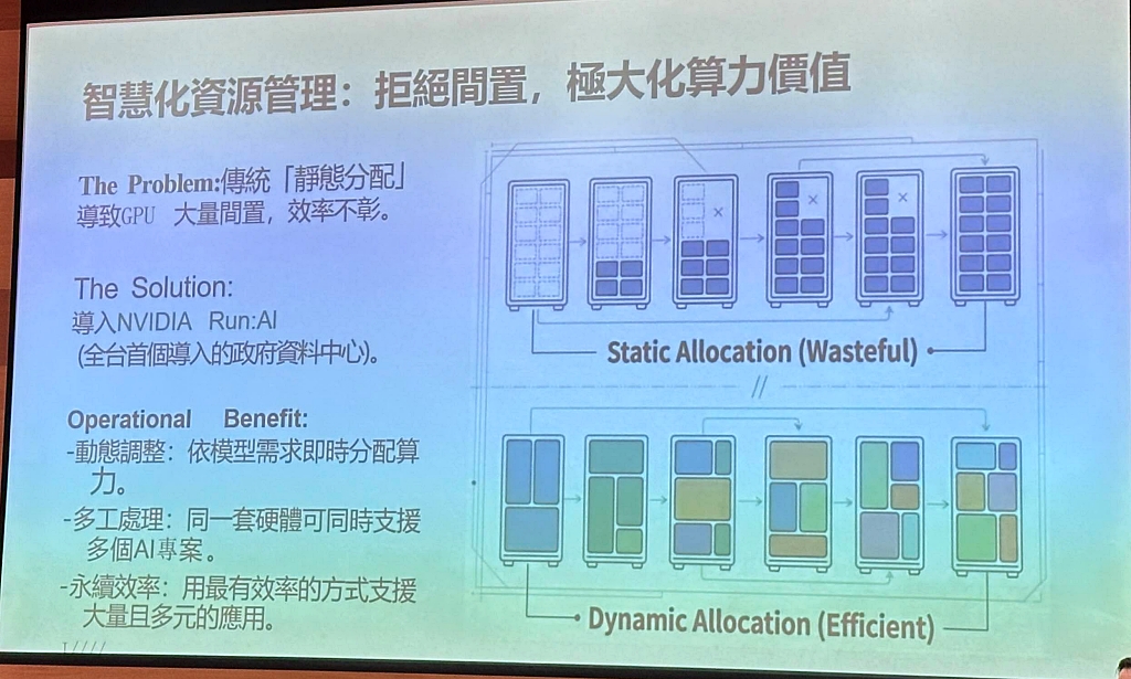 在算力資源管理上,李建璋指出,傳統靜態配置容易造成GPU閒置、使用效率不佳,因此衛福部導入Nvidia的Run:ai解決方案,能依模型需求即時分配算力,讓同一套硬體平行支援多個 AI 專案,提高整體使用效率。
