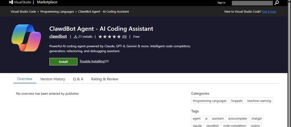 這款套件完整的名稱是「ClawdBot Agent – AI Coding Assistant」,顯然是攻擊者刻意仿冒熱門開源AI代理專案的名稱,藉此降低開發者戒心。值得留意的是該延伸套件在安裝後具備駭客宣稱的功能,表面看起來與一般AI程式碼助理工具無異,反而更容易取得使用者信任。