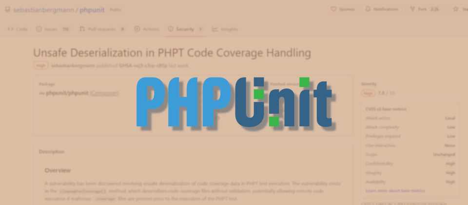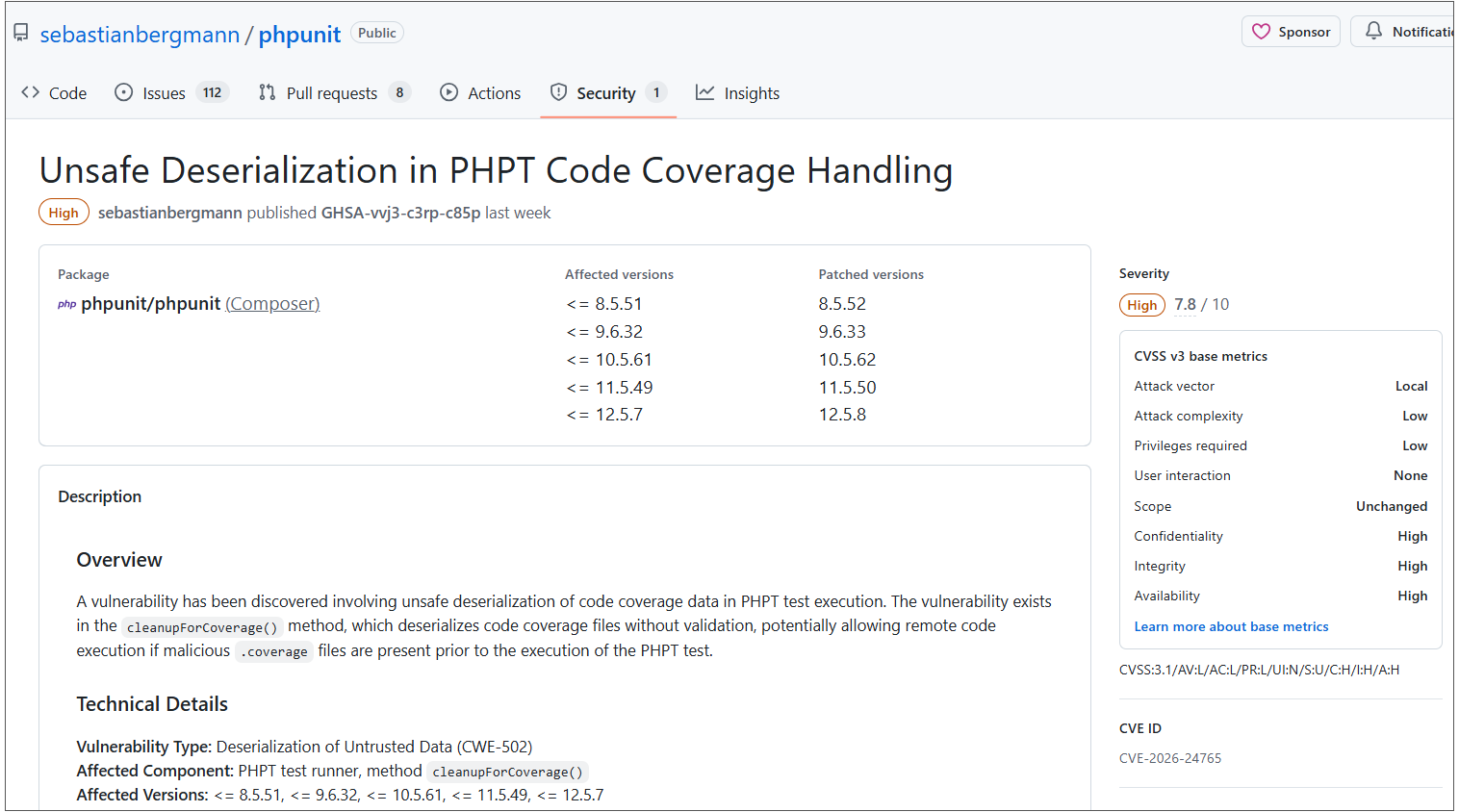 開源PHP單元測試框架PHPUnit存在高風險資安漏洞CVE-2026-24765,CVSS風險分數為7.8分,屬於高風險等級(High)。在特定條件下,若於啟用測試覆蓋率的PHPT測試執行情境中,攻擊者能事先寫入惡意測試覆蓋率資料,便可觸發不安全反序列化,進而執行任意程式碼。