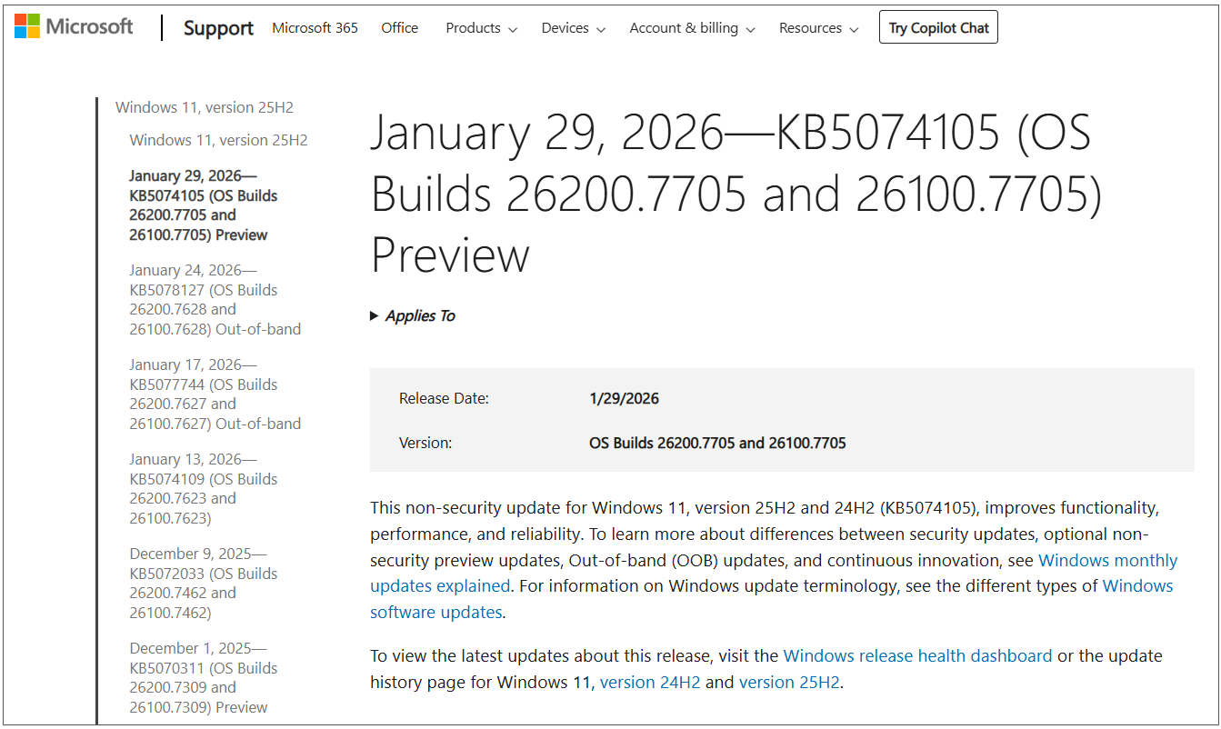 KB5074105為針對Windows 11 24H2及25H2的非安全更新,可解決之前更新造成的問題、改善部份問題,並新增安全功能。已解決的問題,包括從「設定」加入Windows Insider方案時會卡住,開始選單移位或顯示不全,首次登入Windows 11 PC時檔案總管凍結及工作列消失,桌面App消失,更新Windows後無法啟動(activation),Windows無法順利將有效Windows授權註冊到Windows Activation Server,Windows沙箱啟動到一半時停止回應、並出現錯誤碼0x800705b4,非管理員帳號升級欲執行Windows Terminal,PC停止回應,以及輸入問題等。