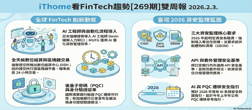 過去幾年,金管會透過金融委外辦法的上雲鬆綁,帶動了臺灣金融產業的上雲潮。2026年,金管會已經預告將再次修改金融委外規定,這次要針對銀行與第三方供應商的委外契約,訂出參考範本,不是採取一體適用的契約,而將針對金融產業特性、供應商所接觸的系統類別、資料敏感度等面向來提供不同資安責任等級的參考委外契約。預計涵蓋資安服務水準會議(SLA)、資料保護責任、對於資安事件之通報時限及資安風險揭露等,另外也會要求供應商必須提供軟體產品的軟體物料清單(SBOM),違反的業者將有罰則。預計一年內完成。