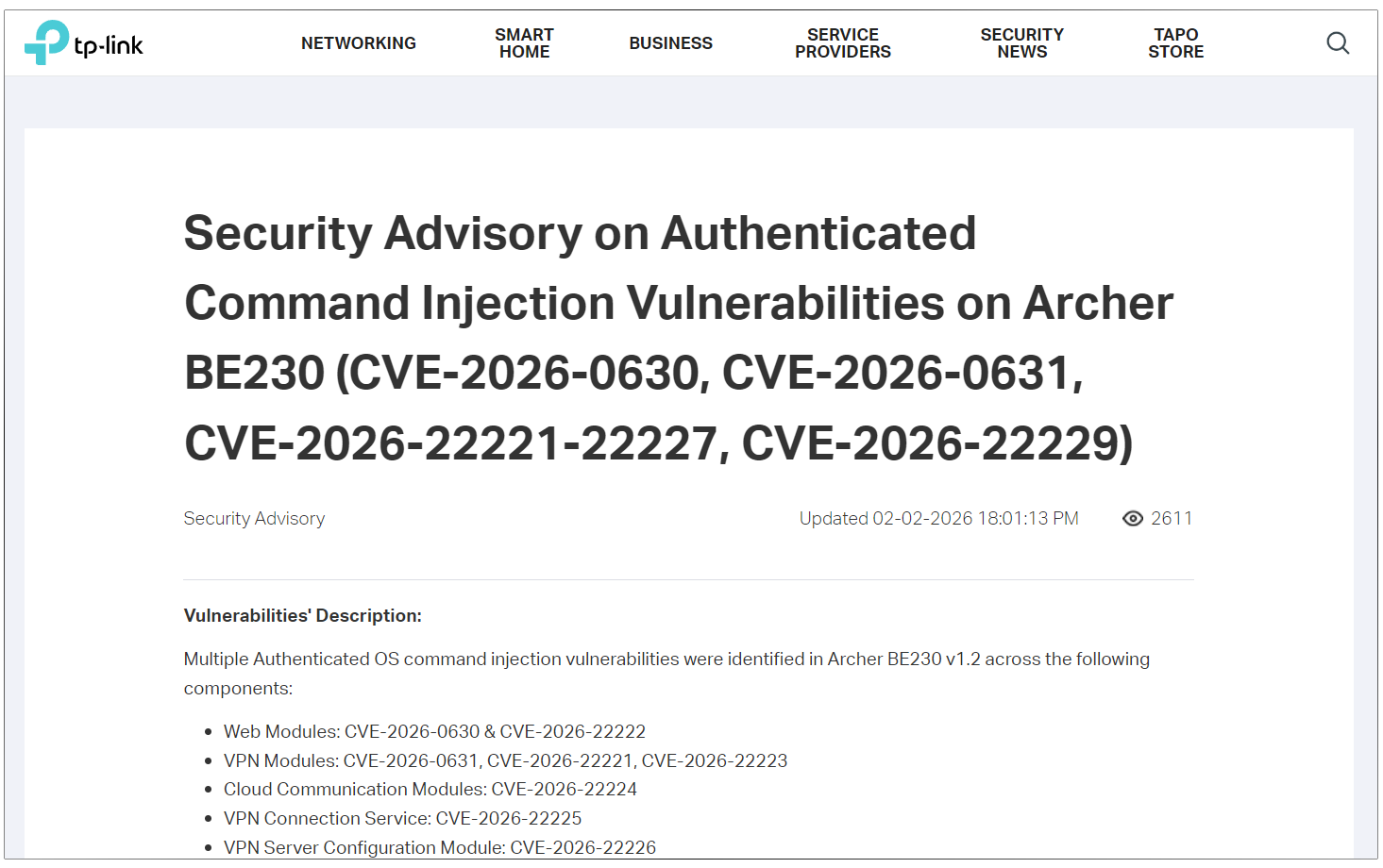 這10個漏洞是出於TP-Link管理介面或特定模組未對輸入進行充分檢查,使得經過驗證的攻擊者得以從Web、VPN或雲端通訊介面等注入並執行系統指令。攻擊者需要先通過管理員身分驗證,但CVE-2026-22229即使沒有物理鄰近(透過匯入變造的VPN用戶端配置檔到Archer BE230)也可能被濫用。