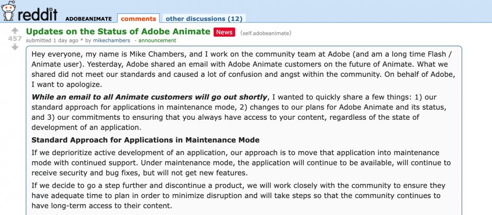 而該事件之所以引發高度關注,也與Adobe對外溝通不一致有關。Adobe社群團隊成員Mike Chambers在Reddit發文說明,先前寄給Animate用戶的通知未能符合Adobe內部的溝通準則,造成社群混亂與焦慮,他代表Adobe致歉。同時也補充,將向所有Animate用戶寄出更新後的電子郵件,並同步說明Adobe對處於維護模式產品的一般作法,也就是持續提供支援、錯誤修正,但不再投入開發新功能。