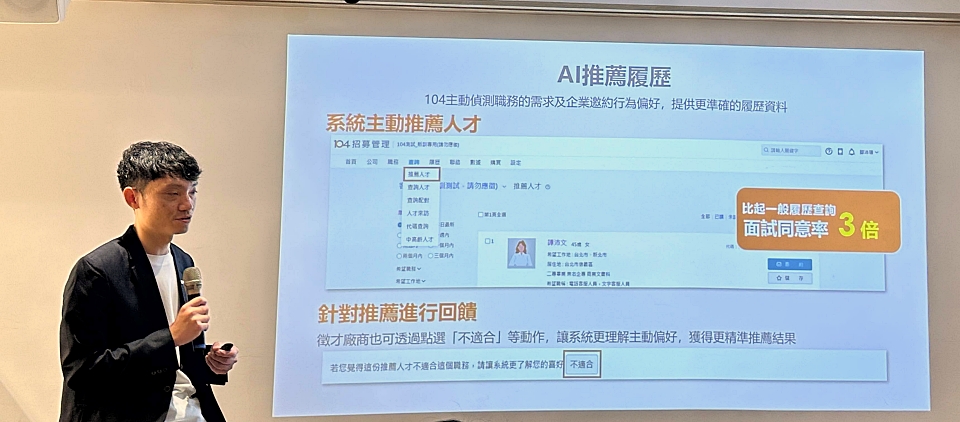在企業端,104也推出AI推薦人才功能,會依據企業刊登的職缺內容,每日主動推薦合適的人才履歷,企業同樣不需先設定篩選條件。若企業認為推薦人選不符合需求,也能在後臺標註「不適合」,協助系統理解偏好、持續優化推薦結果。104統計,透過推薦人才功能發出的面試邀約,其同意率約為一般履歷查詢的3倍。