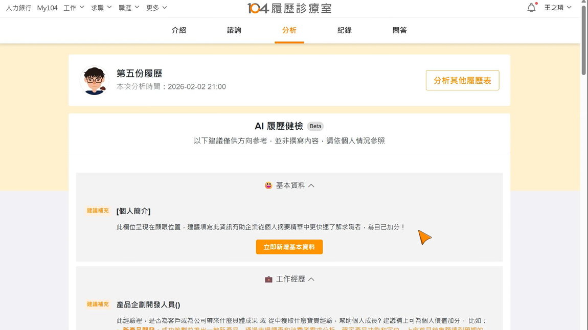 功能三:AI履歷健檢,3秒給出客製化建議