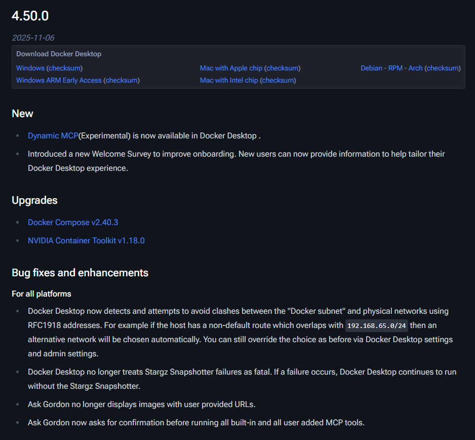 容器平臺業者Docker於2025年11月發布Docker Desktop 4.50.0版,修補旗下AI輔助功能Ask Gordon所涉及的安全風險。相關問題最早由資安研究團隊Noma Labs揭露,研究指出,在特定情境下,AI分析流程可能受到不可信輸入影響,進而對開發環境帶來供應鏈風險。Docker也在同一版本中,一併處理Pillar Security通報的提示注入相關問題。