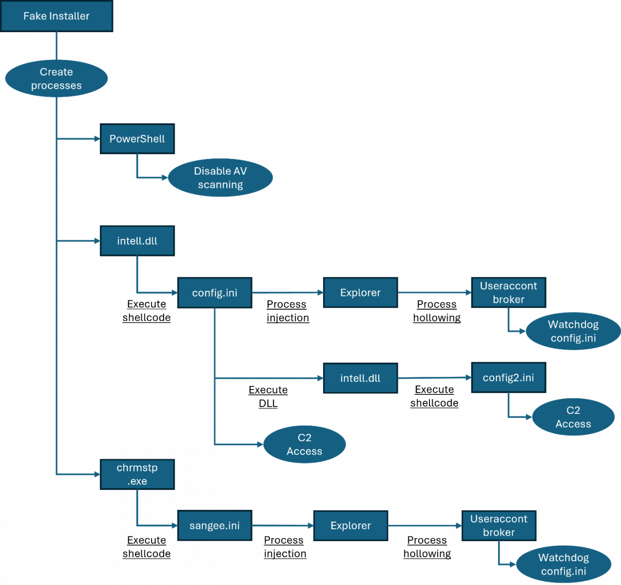 另一個名為config2.ini的Shellcode,會以每15秒一次的頻率,檢查受害電腦是否執行Telegram或WhatsApp。最終惡意程式會透過Windows特定的API,將自己注入指定的Windows檔案總管(File Explorer)處理程序,過程裡運用名為PoolParty Variant 7的手法進行。最終惡意軟體使用標準的Winsock功能函式,連線C2伺服器並下載檔案ValleyRAT。