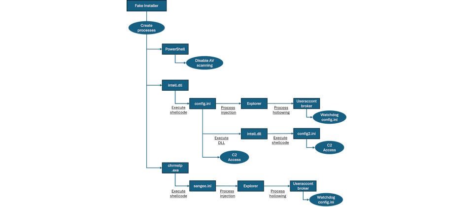 其中,PowerShell被用於執行1組規避Windows內建防毒軟體偵測的命令,將電腦的絕大部分磁碟列入Microsoft Defender排除掃描的區域;rundll32.exe被用來載入惡意DLL檔intel.dll,此DLL檔案將讀取檔名為config.ini與config2.ini的Shellcode,並從C2伺服器下載二進位檔案並執行;第三個檔案chrmstp.exe的行為與intel.dll類似,它從另一個檔案Sangee.ini載入Shellcode,這些作案工具最終於受害電腦植入ValleyRAT。