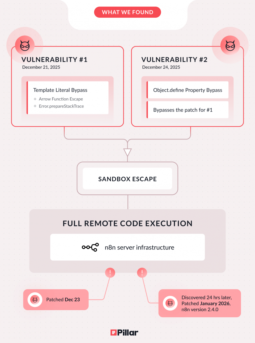 針對CVE-2026-25049發生的原因,Pillar Security表示,源自n8n在評估JavaScript表示式的過程,發現當中使用的沙箱隔離機制存在缺陷。該公司表示他們先找到了範本文字繞過(Template Literal Bypass)的漏洞,此項弱點還疊加了prepareStackTrace,以及Arrow功能等串連而成,能讓攻擊者逃脫特定功能並導致沙箱逃逸,n8n開發工程團隊首度於12月23日試圖修補,但後續發現修補並不完整,於是該團隊在Pillar Security的協助之下,於1月12日發布的2.4.0版本首度完成修補。