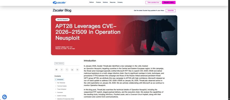 資安公司Zscaler指出,他們自1月29日看到APT28積極利用CVE-2026-21509,駭客利用特製的RTF檔案,並規畫多階段感染鏈,於受害電腦植入後門程式,主要目標是中歐及東歐地區的用戶,包括烏克蘭、斯洛伐克,以及羅馬尼亞,駭客在誘餌文件當中,使用英語或當地語言來從事網路釣魚,過程裡使用以Outlook巨集打造的郵件竊取工具MiniDoor,以及透過惡意程式載入工具PixyNetLoader部署Covenant Grunt。Zscaler將這波攻擊命名為Operation Neusploit,他們與微軟聯手,持續監控相關活動。