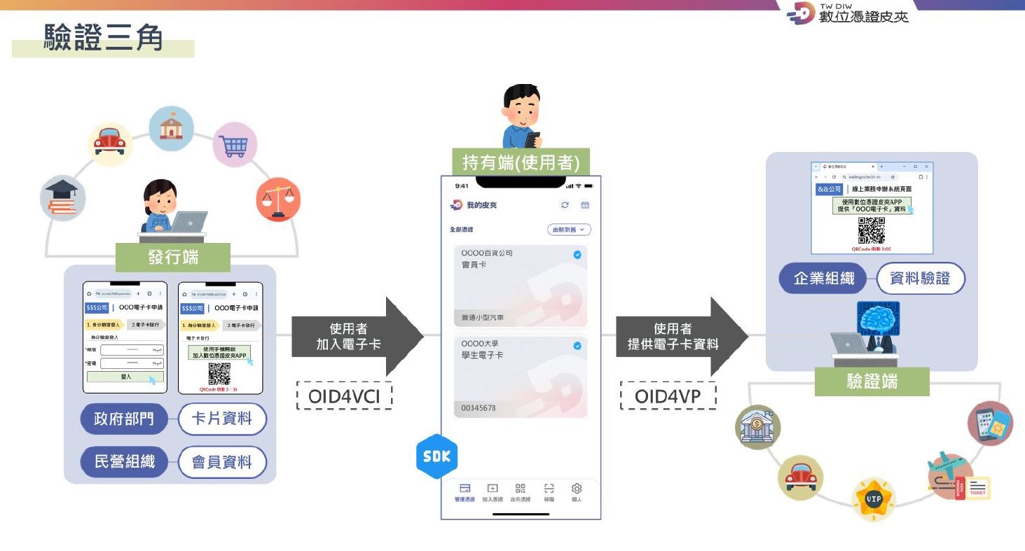 發證方為政府機關或企業,甚至是個人,可以將實體證件、既有電子資料轉換為可驗證憑證(Verifiable Credential,VC);持有者可能是一般民眾,可能具有學生、企業員工或其他身分,獲得發證方的審核取得各種數位憑證(VC)的持有者,在取得發證方的驗證後,並儲存在手機內的數位憑證皮夾App中;驗證方為提供服務的其他政府機關、學校,或是民間業者如超商、租車業者、線上求職等,驗證方向使用者請求並驗證必要的資料。