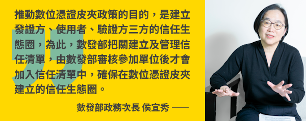侯宜秀指出,在建構發證、使用者、驗證三方的信任生態圈,數發部負責審核管理信任清單,類似於白名單的概念,參與數位憑證皮夾計畫的數位憑證發證方、驗證方,都會由數發部審核後才會加入信任清單中,確保在數位憑證皮夾建立的信任生態圈。