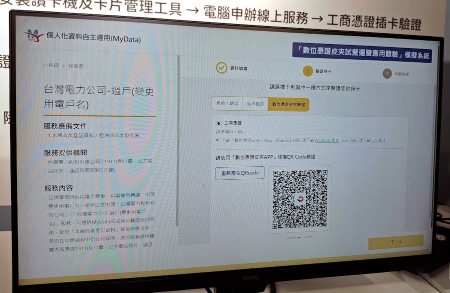數發部與經濟部合作,今年第一季可望讓工商憑證數位化,讓企業主可將工商憑證加入數位憑證皮夾App,並且用於MyData的服務身分驗證上,例如向台電申請用電戶過戶,透過MyData授權資料申請服務。(攝影/蘇文彬)