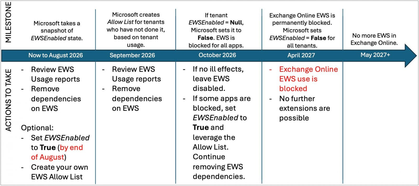 但關閉EWS將以階段性、可控制的措施進行。從即日起到2026年8月30日,企業可以自建EWS允許清單,從9月1日起企業就不能再自建,將由微軟根據租戶使用狀況建立允許清單,並移除相依性。從10月1日起,微軟就會嘗試關閉EWS,並視App是否正常運作。2027年4月1日起正式封鎖Exchange Online EWS的使用,不許再延長使用。