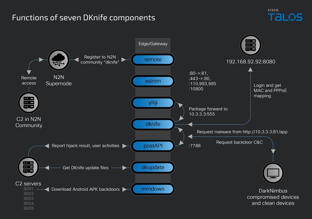 思科威脅情報團隊Talos發現名為DKnife的惡意程式,此為高階閘道監控與對手中間人攻擊框架,該工具具備深度封包檢測與流量操控能力,能在網路邊緣設備層級攔截、修改合法流量,並用於散播後門程式,Talos研判,其背後的攻擊者,可能來自中國。