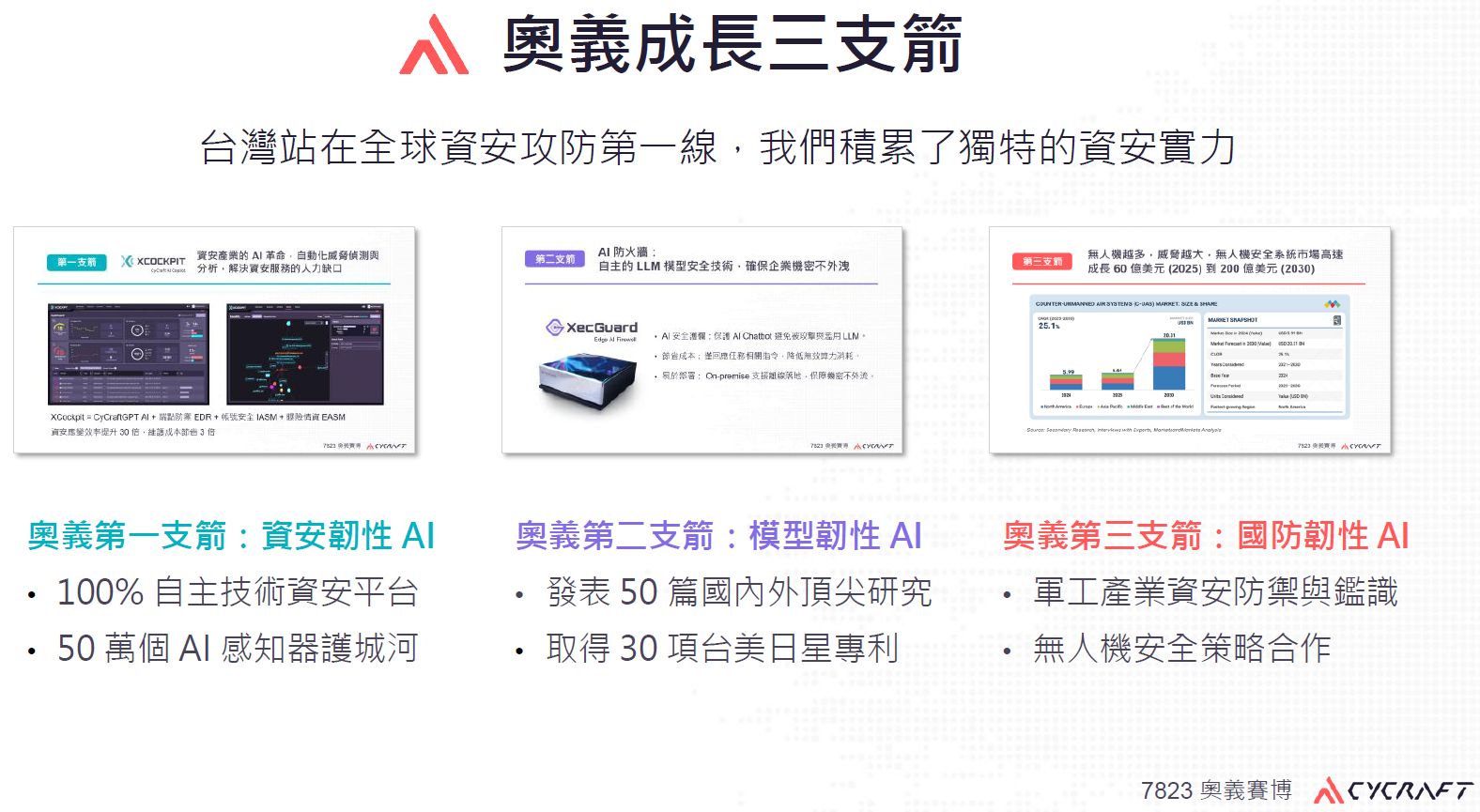 經過9年的戮力經營,奧義智慧1月首度公開揭露他們布局的三大成長引擎:資安韌性AI應用、AI模型韌性強固,以及國防AI韌性自主,對應的解決方案,分別是端點安全系統XCockpit、AI防火牆XecGuard,以及無人機反制系統XecDefend。