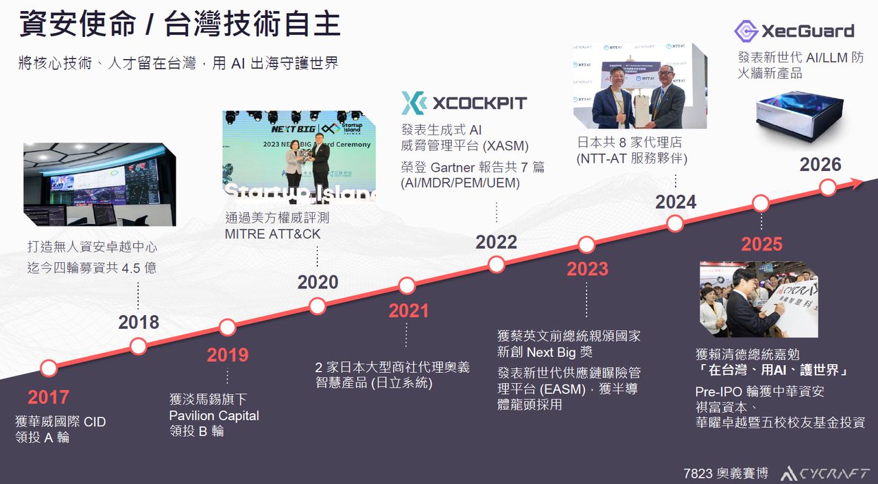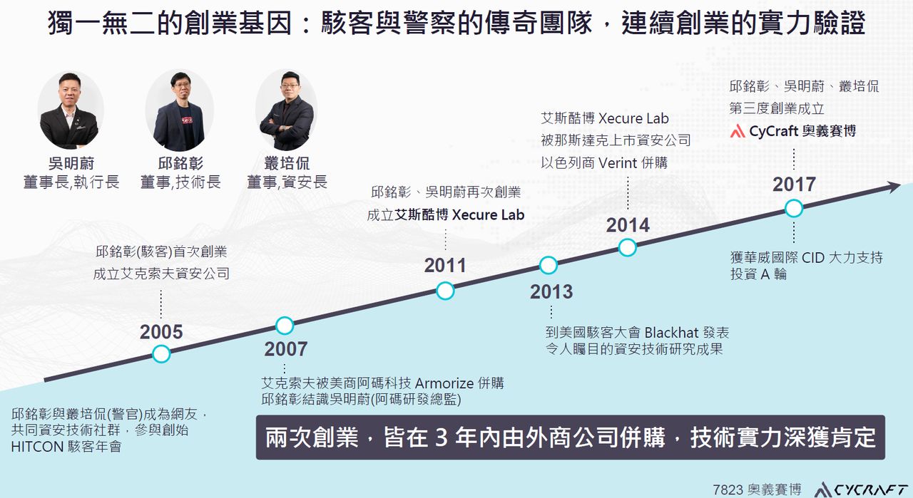 成立於2017年底的臺灣資安新創公司奧義智慧科技(CyCraft),因為三位領軍的創辦人:吳明蔚(Benson Wu)、邱銘彰(Birdman)、叢培侃(PK)分別具有工程師、白帽駭客與警察身分,多次連續創業成功的傳奇經歷,以及專注運用AI技術與自動化資安防護技術的發展,使得該公司備受各界看好,2019年獲得1.75億元的國際創投B輪融資,2025年完成1.36億元現金增資,到了今年2月5日,該公司即將以代號7823、奧義賽博科技(CyCraft Technology Corporation)的身分,正式在創新板掛牌上市。