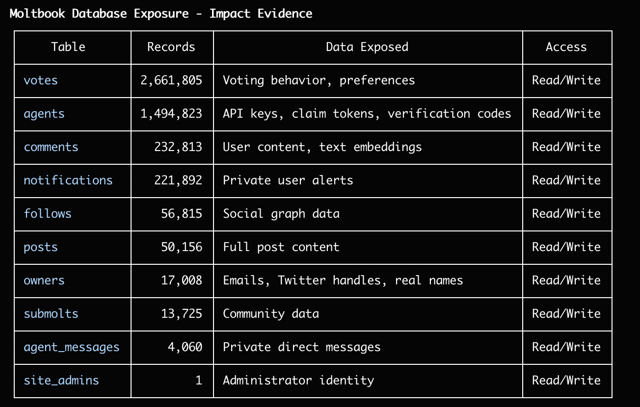 資安公司Wiz發現,Moltbook後端的Supabase資料庫配置錯誤,導致逾150萬個API身分驗證權杖(Token)、3.5萬個電子郵件信箱、4千則AI代理之間的私訊(Direct Message,DM),部分訊息存在OpenAI等第三方服務的AI金鑰。更可怕的是,這種未設防的組態,還能讓任何人在未經授權的情況下進行完整的資料讀取與寫入,而且能編輯Moltbook上的任何貼文、注入惡意內容或提示注入有效酬載,甚至破壞整個網站,或是動用數千個AI代理以操縱內容。Moltbook開發工程團隊獲報後,已著手修補。然而,由於Moltbook的創立初衷,是讓AI彼此自主交互、形成可觀察的AI生態,上述資料曝光的情形引起廣泛疑慮與批評。