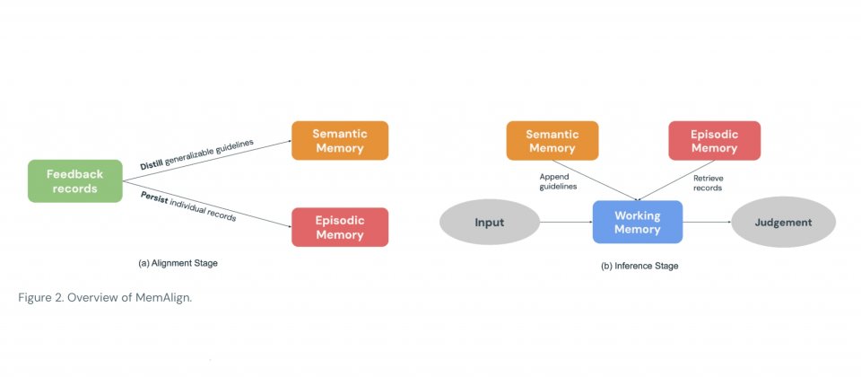 MemAlign採用雙記憶體架構,不必更新模型權重。系統會把專家以自然語言寫下的回饋,萃取為可在不同情境重複使用的原則,存入語意記憶,同時把較難用原則完整涵蓋,也較容易出錯的具體案例保留在情節記憶。當新輸入到來時,MemAlign會先彙整既有原則,並從情節記憶中檢索相近案例,一起組成工作記憶作為當次評估的參考脈絡,再交由LLM完成評分。記憶內容也支援刪除或覆寫,方便因應規定調整、需求變更,或資料清除等情境。