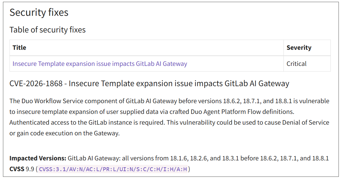 根據GitLab官方資安公告說明,CVE-2026-1868的成因與不安全的模板展開(Insecure Template Expansion)有關。系統在處理使用者提供的工作流程定義與模板資料時,未能妥善限制特定輸入內容,導致在符合條件的情境下,攻擊者可影響指令生成與執行流程,進一步放大攻擊影響範圍。