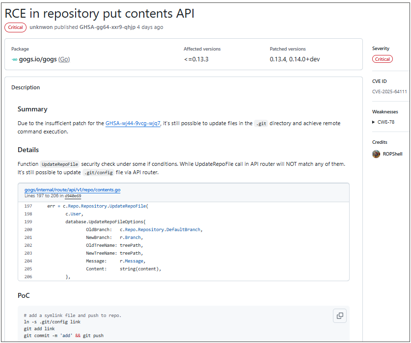 在3項漏洞中,影響最為嚴重的是CVE-2025-64111,CVSS v3.1風險分數為9.3分,屬於重大風險等級。該漏洞被視為先前影響Gogs儲存庫更新流程的漏洞CVE-2024-56731之延伸問題,顯示既有防護機制仍存在可被繞過的情況。