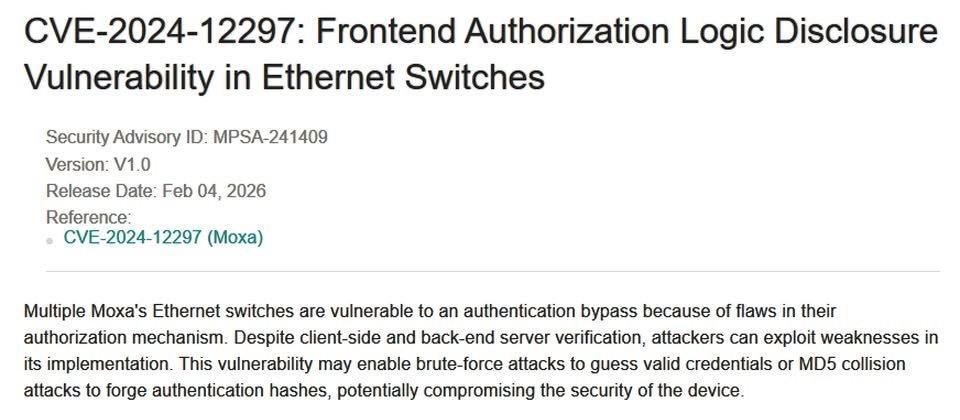 臺灣工控設備製造商四零四科技(Moxa)於2月4日發布資安公告,指出旗下的TN-A與TN-G系列的部分型號交換器存在CVE-2024-12297,此為前端授權邏輯造成的資訊洩漏弱點,CVSS v4.0風險評為9.2分(滿分10分),危害程度屬於重大等級(Critical),該公司呼籲用戶應儘速套用新版韌體因應。我們也向四零四科技進一步詢問,該公司表示,目前尚未收到漏洞被利用的訊息。