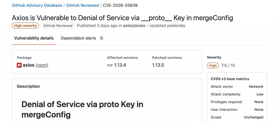 常用JavaScript HTTP用戶端程式庫Axios被揭露存在拒絕服務(DoS)漏洞CVE-2026-25639。漏洞成因是Axios在合併請求設定時,當遇到包含__proto__且被視為自有屬性的設定物件,程式會丟出TypeError並直接崩潰,進而讓服務中斷。