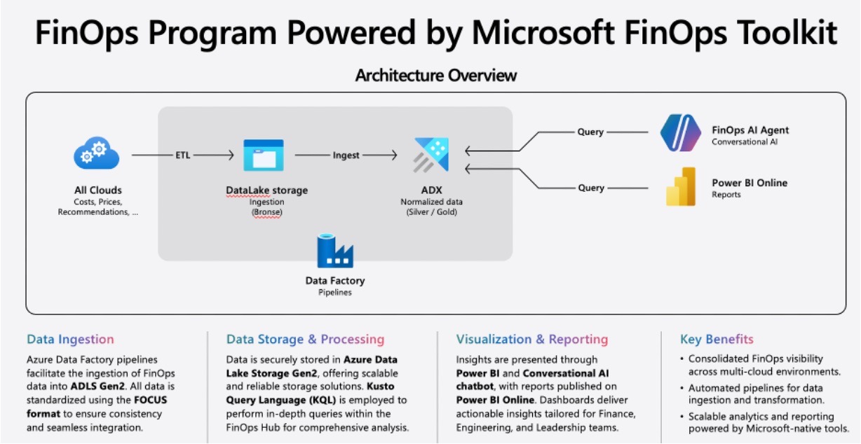 接著,將這些FinOps數據儲存到Azure Data Lake Storage上,方便支援微軟的數據分析Kusto查詢語言(KQL),最後,透過兩個管道,提供給使用者查詢和分析這些數據,一個是線上版Power BI服務,另一個是有一款對話式的FinOps AI代理,可以提供各種FinOps視覺化儀表板和相關報表,給財務人員、工程師和高階主管參考。