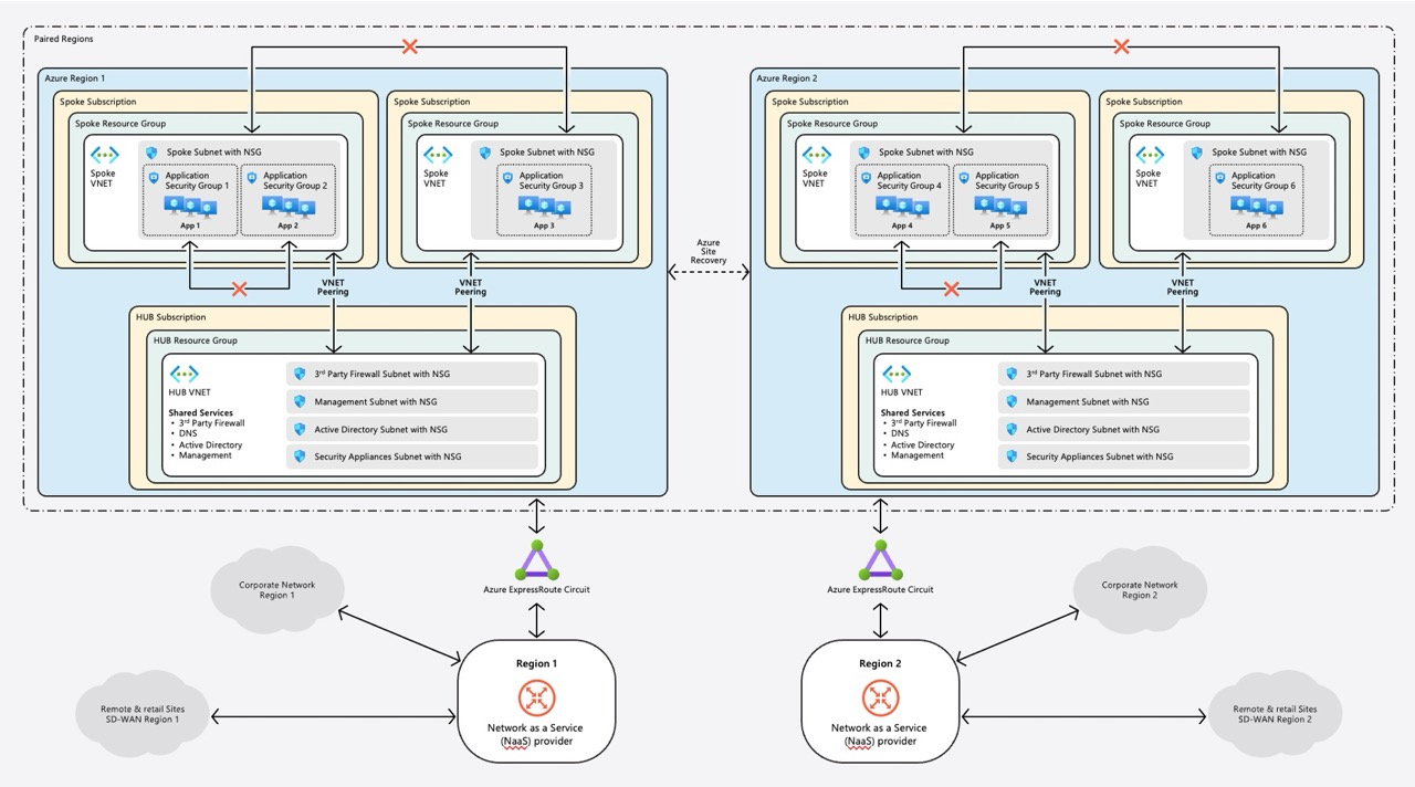 因為Levi’s集團業務遍佈全球120國,他們將所有服務搬上公雲時候,採取了零信任架構的設計來確保安全,並且將共用的核心服務和關鍵資源,集中到中央節點的Hub區中,各個不同的應用系統或服務有自己的公雲訂閱帳戶,各自屬於一個個獨立的分支(Spoke),Levi’s集團會限制不同分支之間的橫向流量,不同分支(雲端訂閱帳戶)的AP,預設不能互相溝通,除非獲得授權,來降低風險。所有數據會儲存在靠近顧客的公雲資料中心內,在2021到2026年之間,地端資料中心還沒完全關閉之前,會用ExpressRoute 和 SD-WAN 建立地端機房與公雲業者機房之間的高速網路連線。