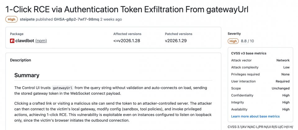 一旦權杖遭竊,攻擊者就可能取得對Gateway API的操作權限,進而接管Gateway,並在Gateway主機上達成程式碼執行。該漏洞已在Clawdbot v2026.1.29修補,受影響版本為Clawdbot v2026.1.28含以前。通報給出CVSS 3.1總分8.8,等級為高風險。