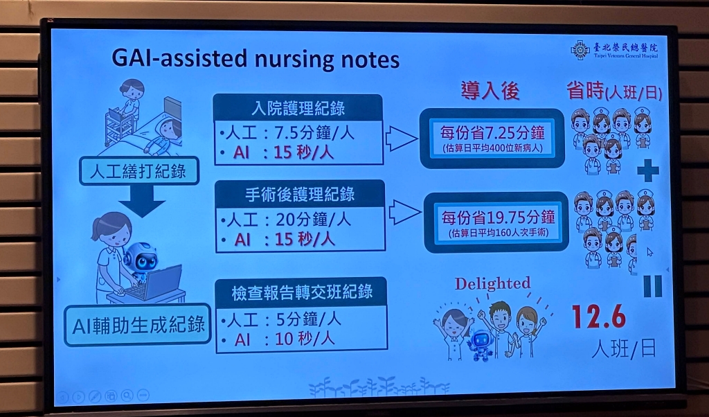 在這個電子病歷系統架構下,北榮也有結合AI的應用實例。例如,他們去年開始導入護理紀錄自動化工具,原本手動輸入入院護理紀錄平均需7.5分鐘,導入後可縮短至約15秒;手術護理紀錄更從20分鐘縮短至15秒。李偉強直言,AI工具能否被長期使用,關鍵在於算力與系統穩定性,如果系統反應變慢,再好的功能也很難真正落地。