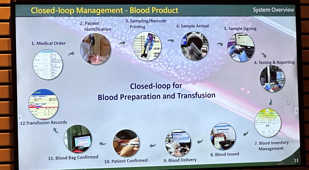 就輸血閉環管理而言,則涵蓋12個環節,從醫師下達輸血醫囑開始,到輸血完成與紀錄回填,每一個環節都有資訊系統串接、驗證和回饋,一樣沒有資訊斷點。