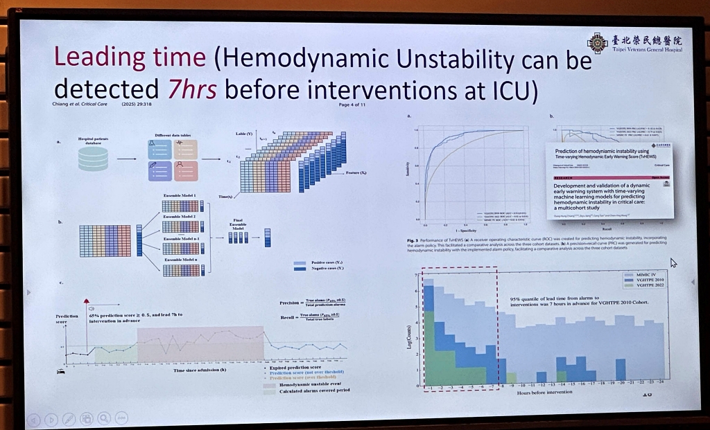 在重症照護方面,北榮也有多項CDSS成果。例如,一套AI模型可提前7小時,預警ICU病人可能出現休克等血流動力學不穩定狀況。
